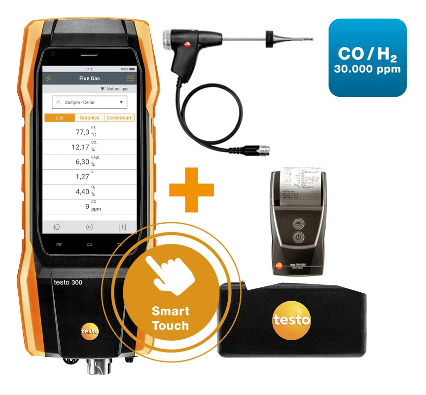 - In the kit: testo 300 NEXT LEVEL flue gas analyzer, including O2 and CO H2-compensated sensor up to 8,000 ppm, mains unit, basic flue gas probe, testo Bluetooth® Connector, spare dirt filters, EasyHeat software, instrument bag
