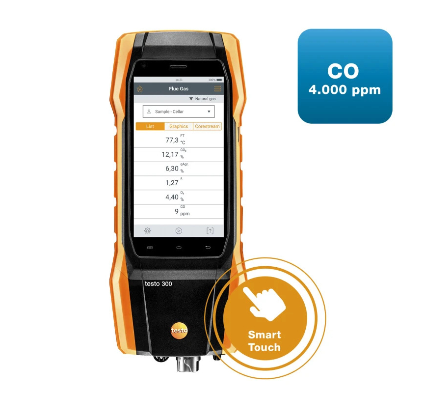 The testo 300 flue gas analyzer is ideal for the most important measurements involving heating systems. It combines decades of experience in measuring technology with contemporary smart-touch operation, robust construction and e-mailing of reports. The testo 300 enables easy measurement of flue gas, draught, pressure, ambient CO and differential temperature.