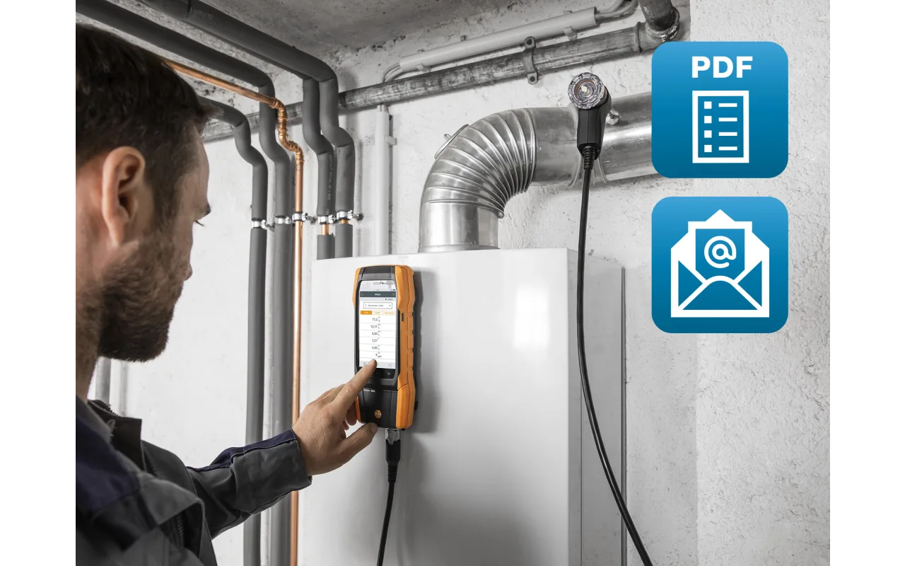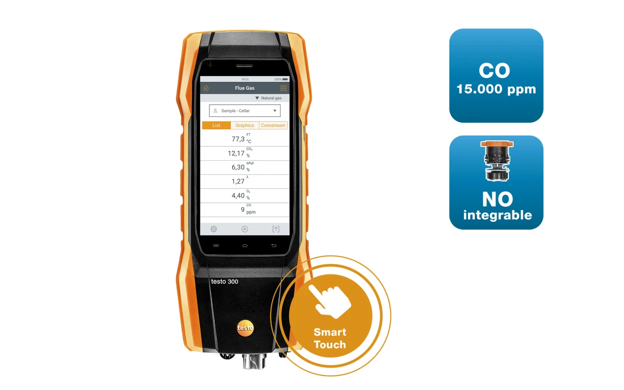 - In the kit: testo 300 NEXT LEVEL flue gas analyzer, including O2 and CO H2-compensated sensor up to 8,000 ppm, mains unit, basic flue gas probe, testo Bluetooth® Connector, spare dirt filters, EasyHeat software, instrument bag