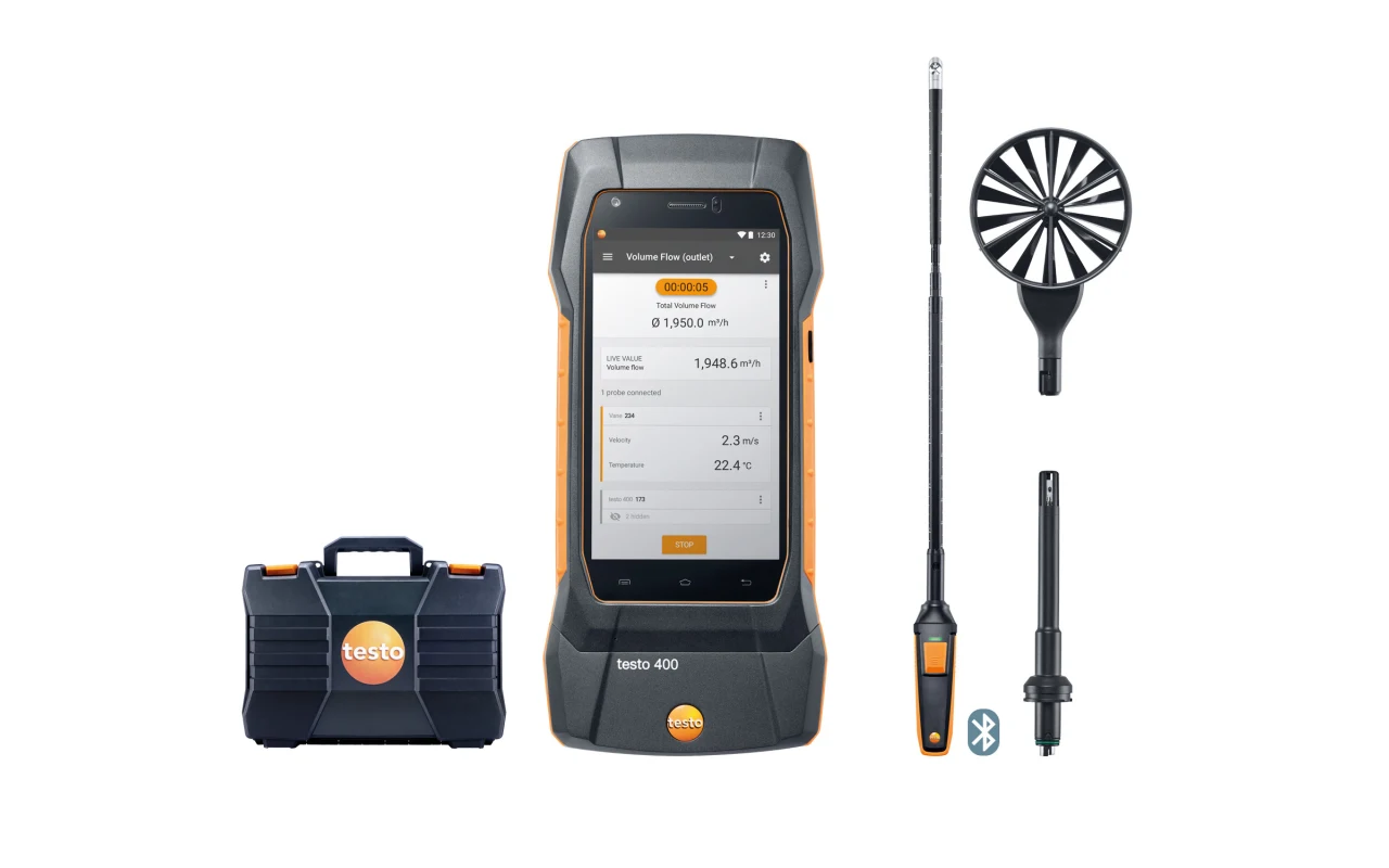testo 400 is the universal measuring instrument for all IAQ professionals, enabling them to measure, document and analyze all IAQ parameters with just one instrument. Your benefits: – Smart support through stored measurement menus and evaluation of measuring values according to the traffic light principle – for error-free measurements