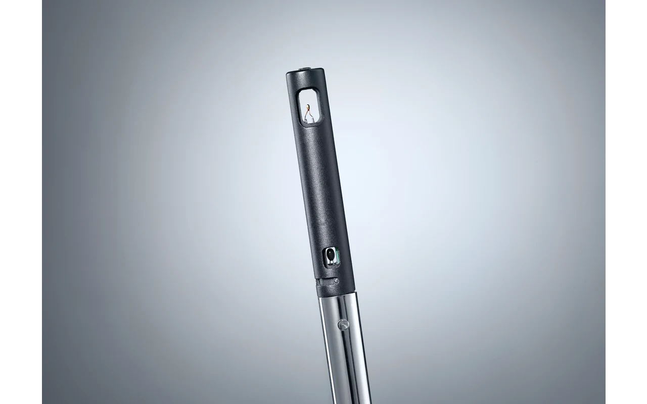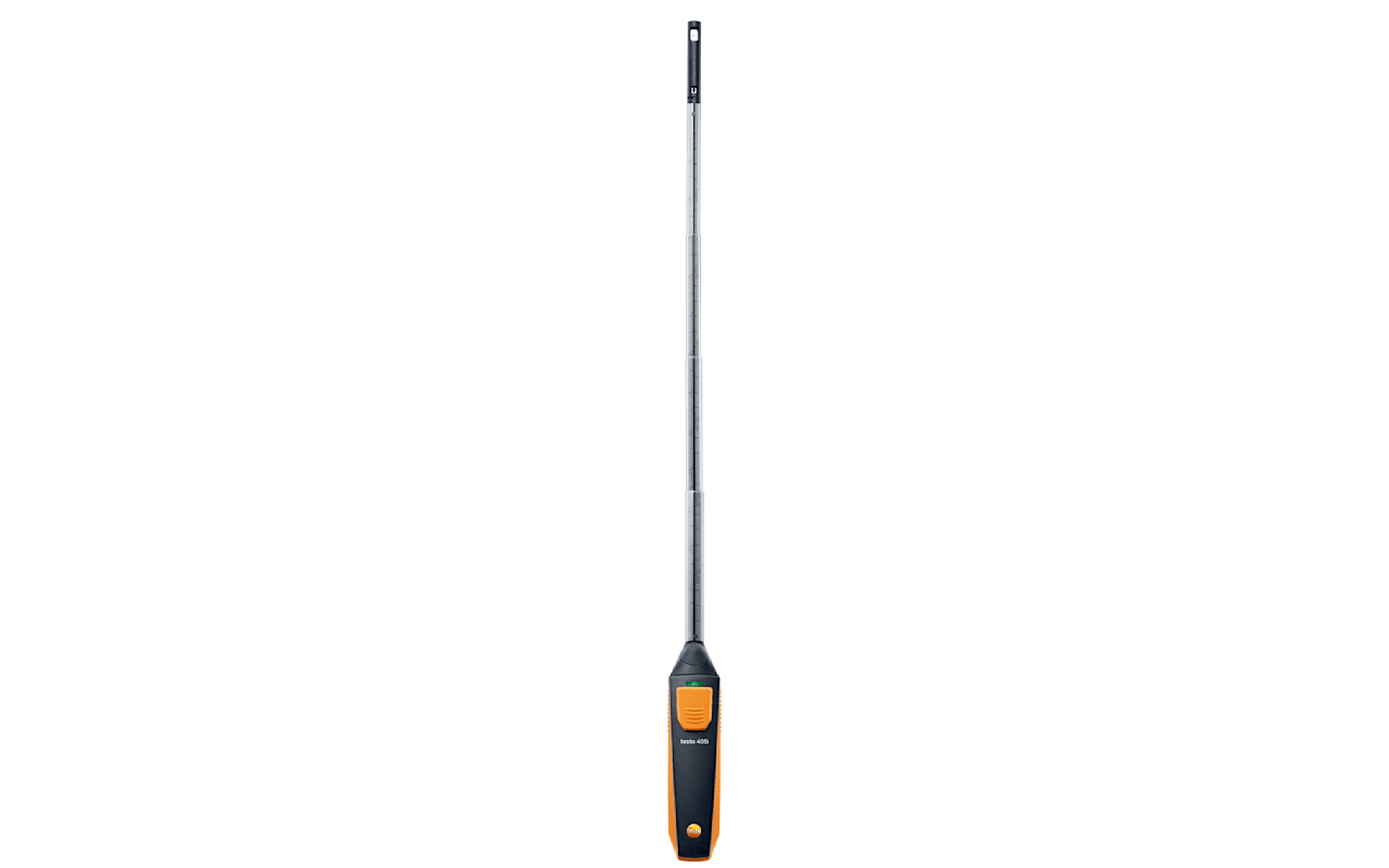 The hot-wire anemometer testo 405i, in combination with a smartphone or tablet, is a compact measuring instrument for air flow velocities, temperatures and volume flows. Equipped with a telescopic shaft, extendable to 400 mm, it allows flexible applications in rooms and ducts.