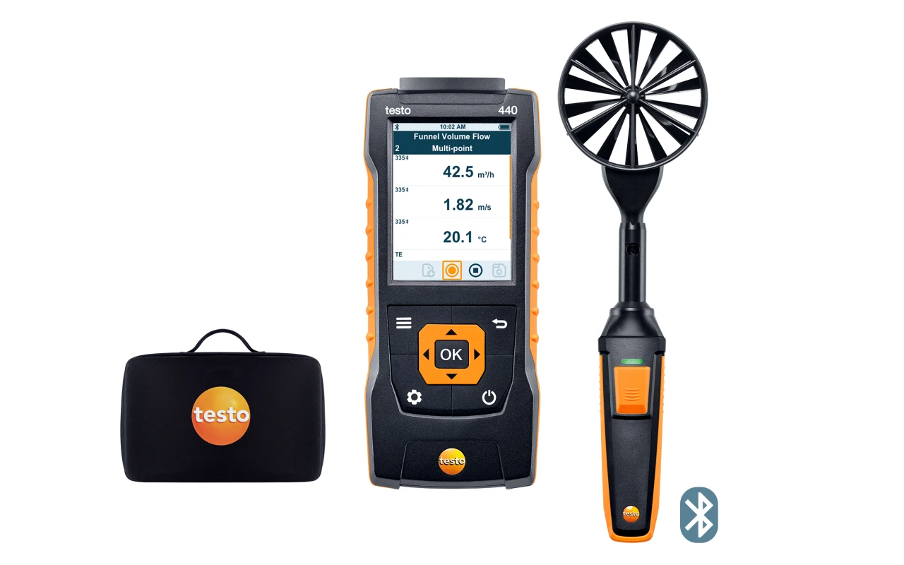 The testo 440 combines the benefits of a compact handheld device with intuitive measurement menus and a comprehensive selection of air velocity & IAQ probes. This means you have all measuring tasks on air conditioning and ventilation systems reliably under control
