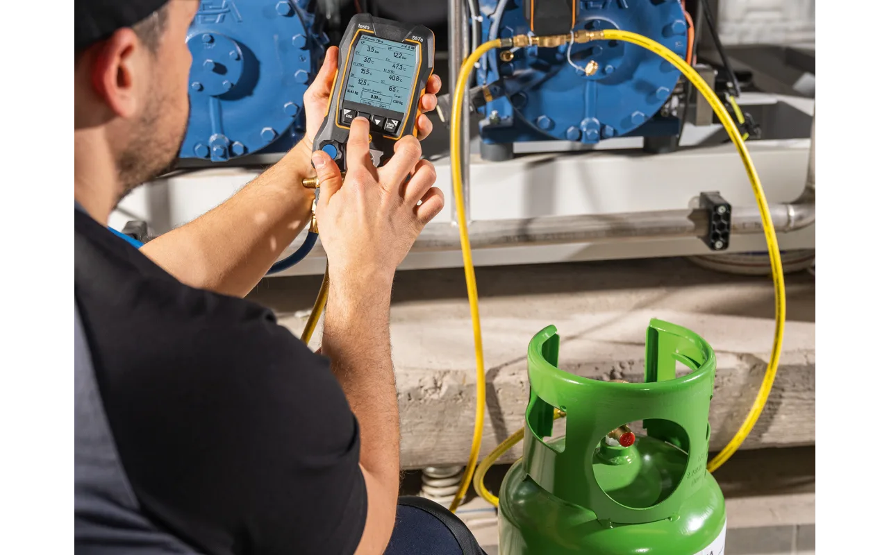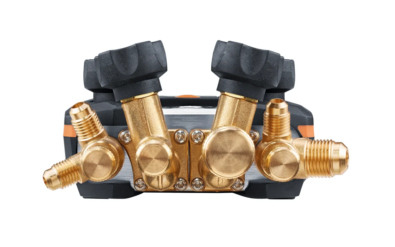The testo 550i digital manifold enables digitally versed technicians to control their daily servicing and maintenance work on refrigeration and air conditioning systems and heat pumps entirely via App and smartphone/tablet. Equipped with a 2-way valve block and robust hook, the testo 550i saves you time with its fast and easy measurements, clearly presented results and digital documentation.