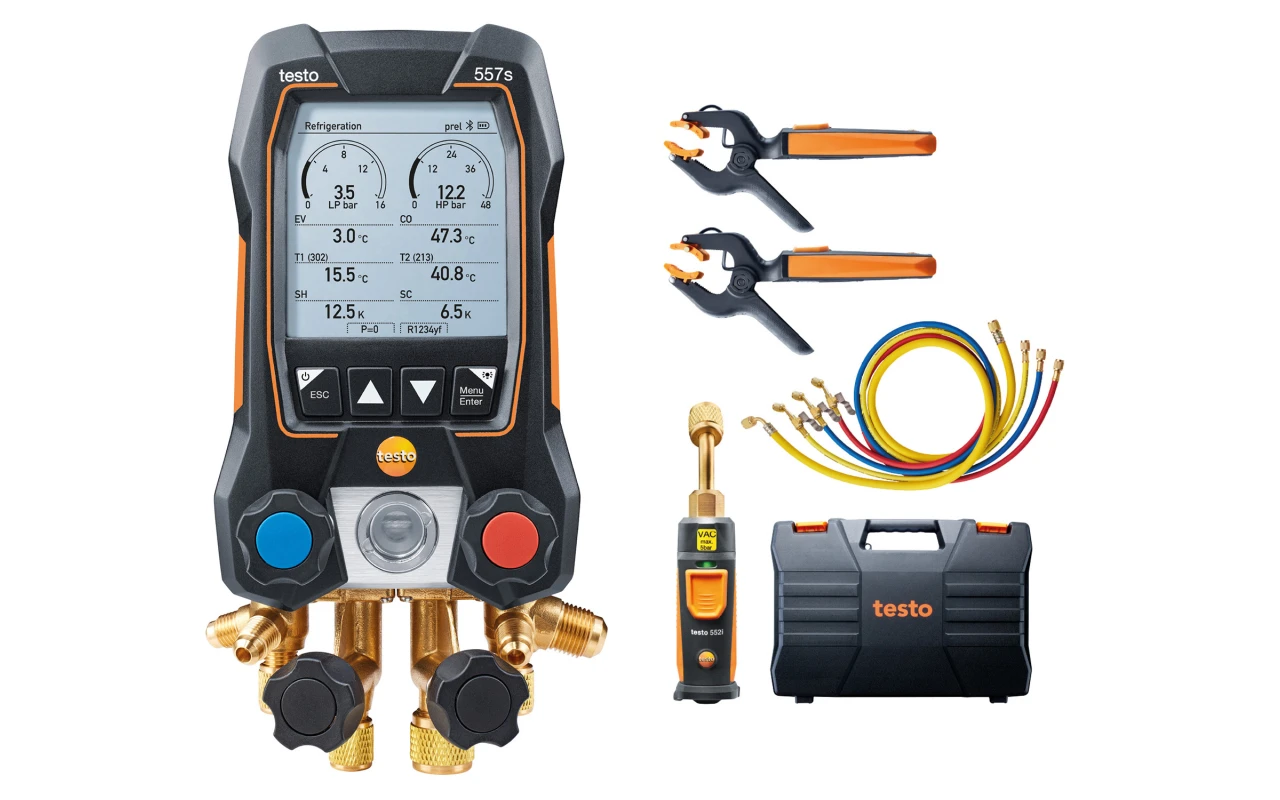 testo 557s Smart Vacuum Kit with filling hoses – Smart digital manifold with wireless vacuum and clamp temperature probes and hose filling set with 4 hoses