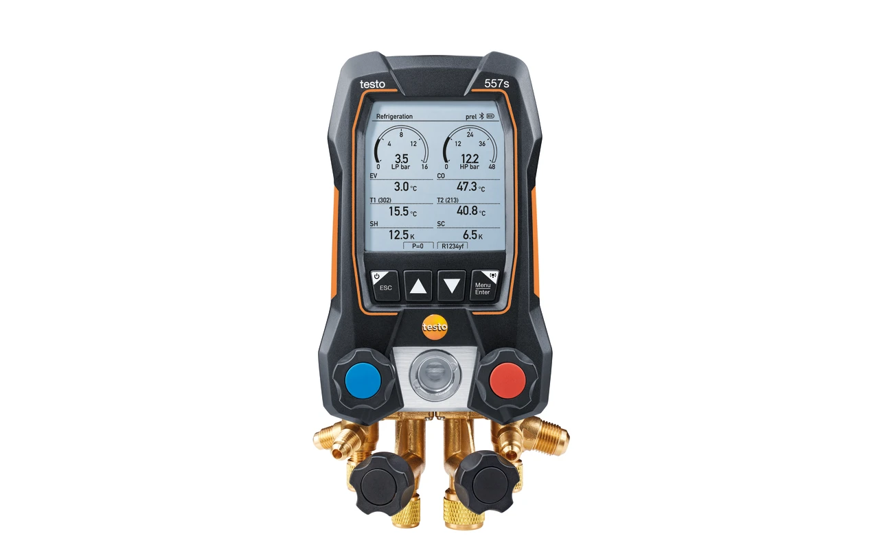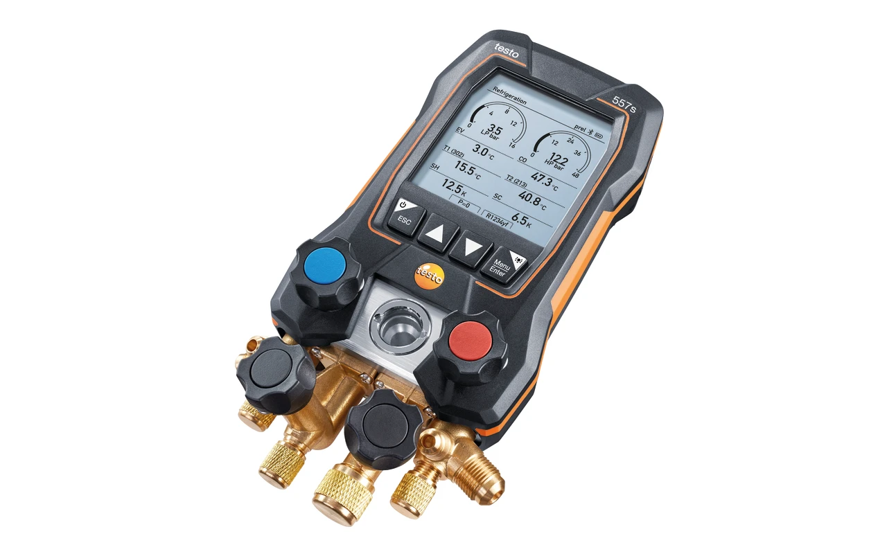 The testo 557s digital manifold with 4-way valve block enables you to carry out your measurements on refrigeration and air conditioning systems and heat pumps particularly fast. The large display also helps you to evaluate the results in graphic form. Stored programs guide you through the measurement and enable the automatic determination of numerous important system parameters such as superheat, pressure drop test or evacuation.