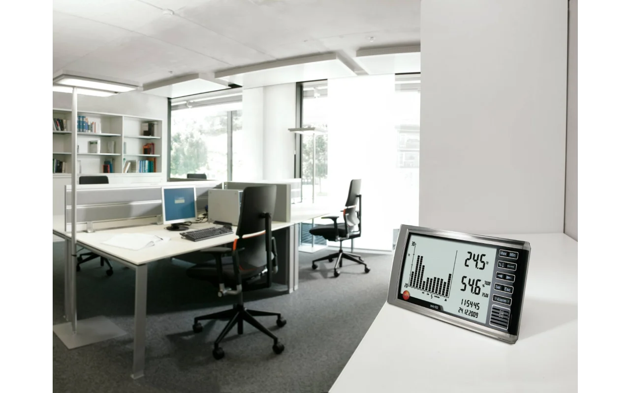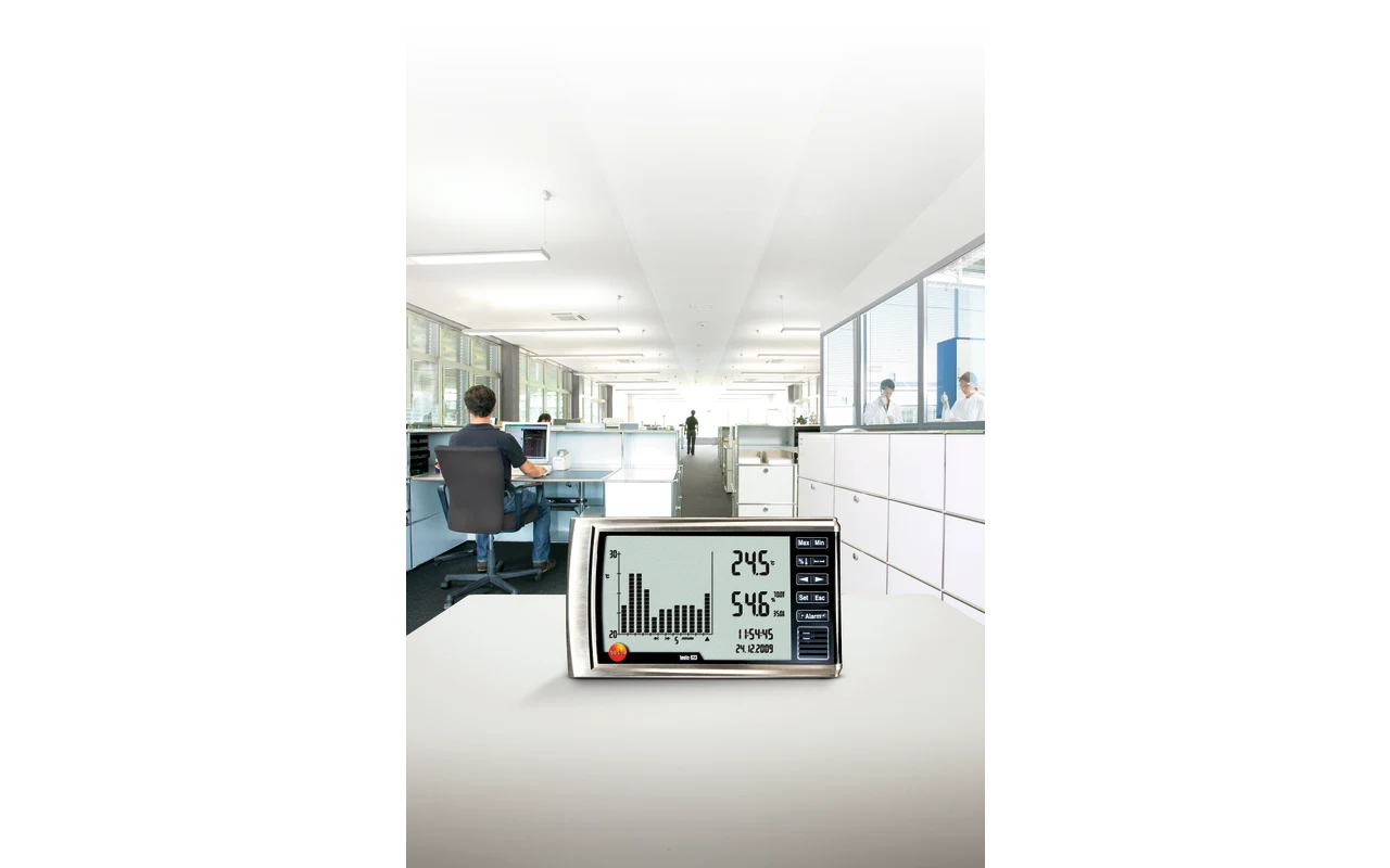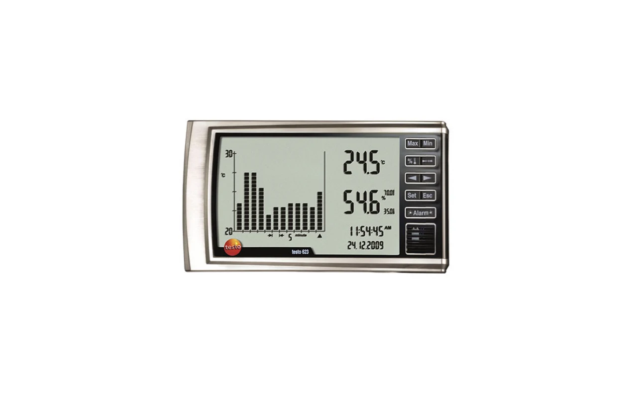 The temperature and humidity measuring instrument testo 623 shows current and past temperature and humidity values as well as date and time, simultaneously in a large, clear display. This way, you have all important values constantly in view.