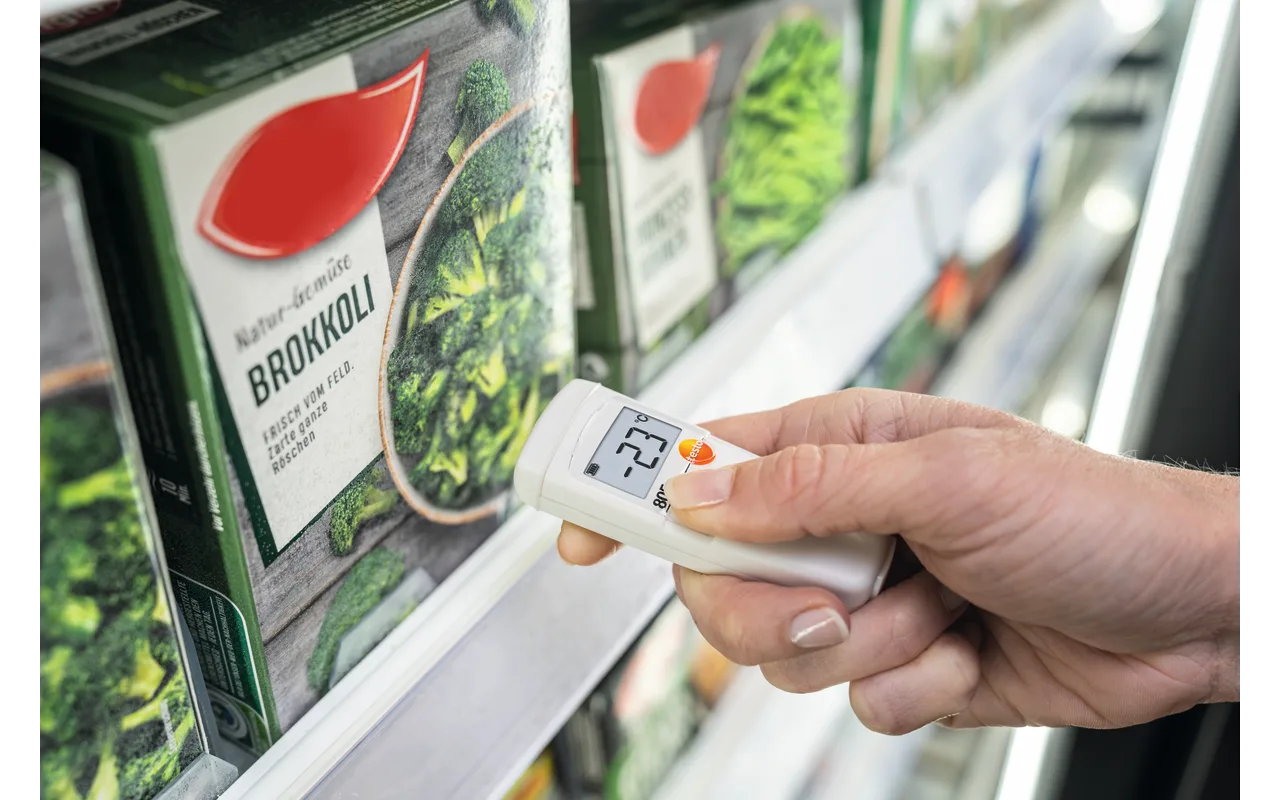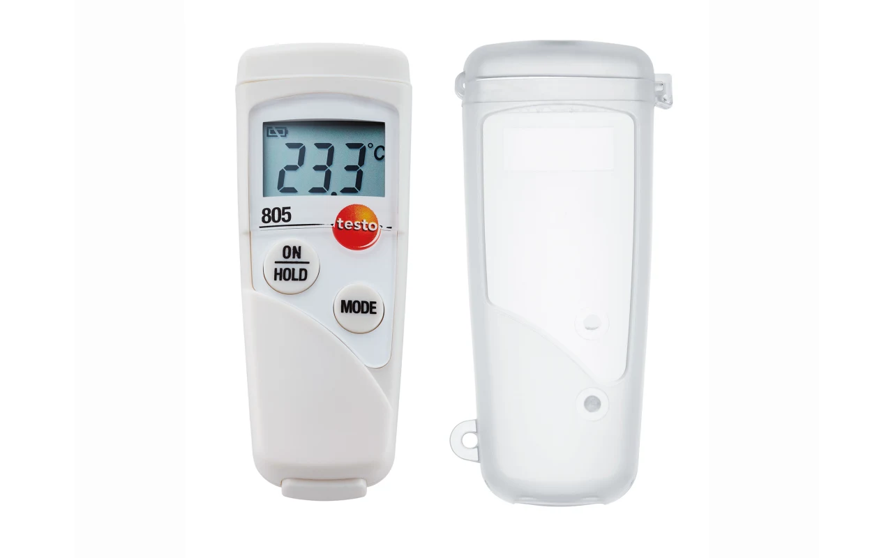 The infrared thermometer, measuring only 80 mm, fits in any jacket pocket, and is always ready to hand for fast measurements. The testo 805 is used, for example, for measurements in Incoming Goods and in temperature checks in supermarket shelves. It is also optimally suited to fast measurements in the food sector and in facility technology.
