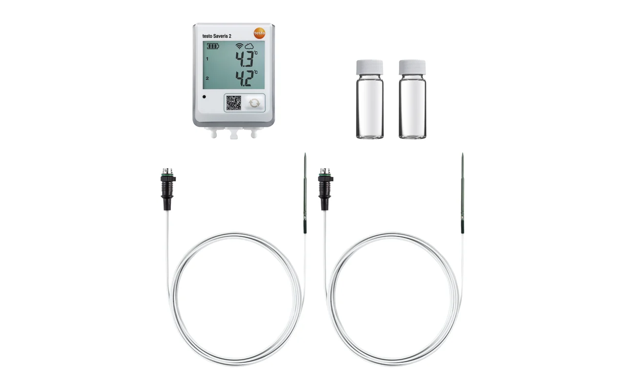 testo Saveris 2-T2; WiFi data logger (wireless LAN) with display for measuring the temperature, two connections for external NTC temperature probes or door contacts, incl. two ribbon-cable temperature probes, two temperature simulation flasks for filling with a temperature buffer suitable for each respective area of application